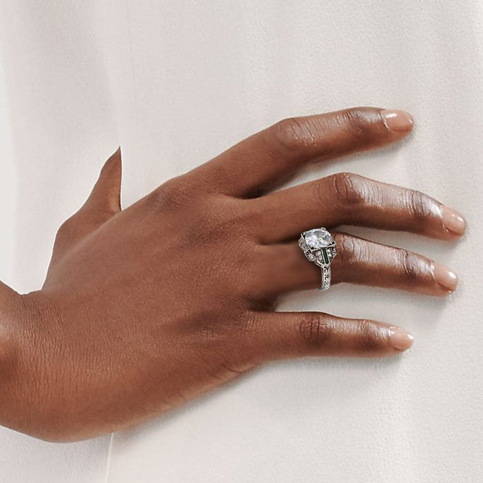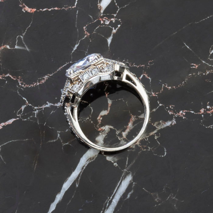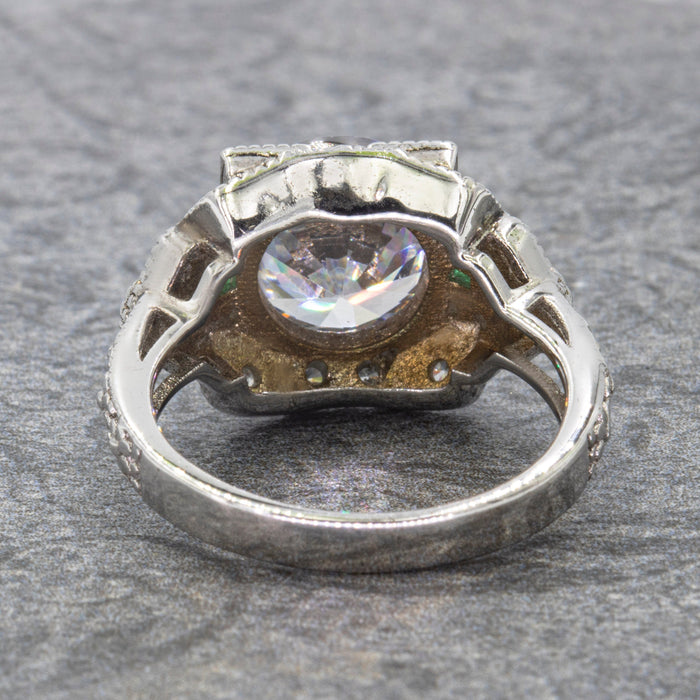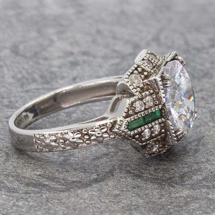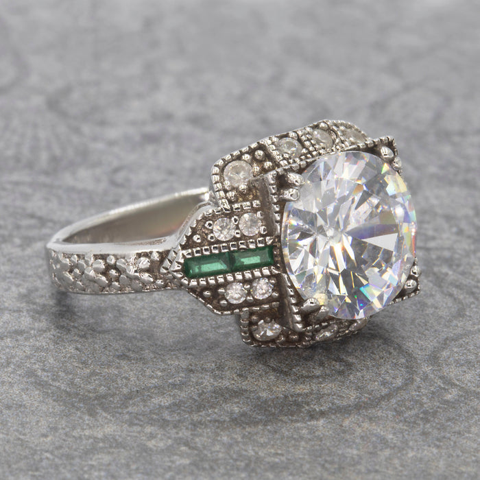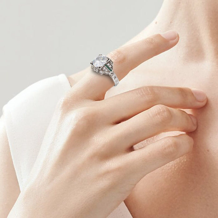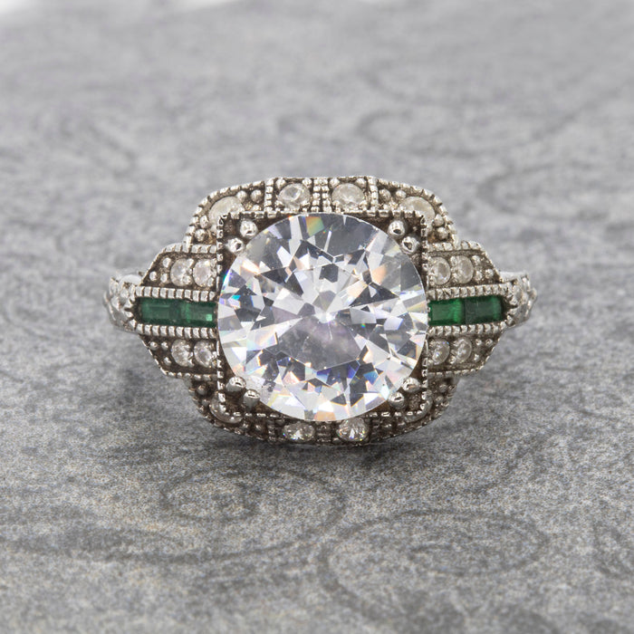 From the creative minds at Avena comes 'Lucille', a classic ring that captures the essence of the art deco period with its milgrain patterns and baguette channel-set side stones.
