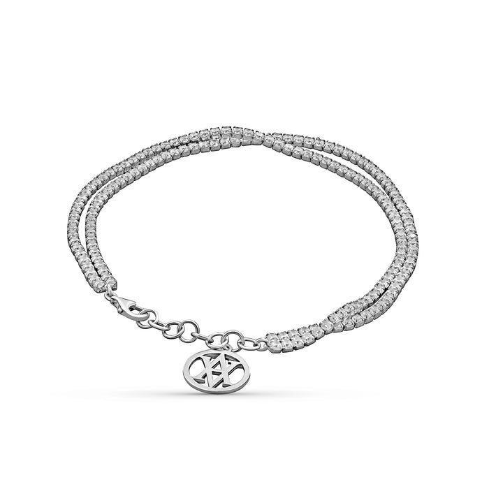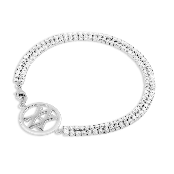 Avena presents the iconic original monogram signature as a regal stacking tennis bracelet. A perfect gift, this delicate bracelet is a timeless chic ornament for the wrist.