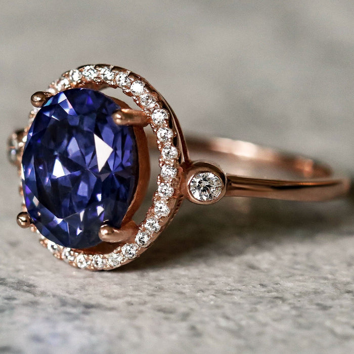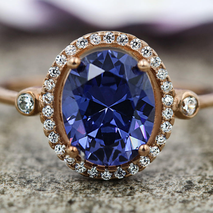 A deep rich ocean bordered by glimmering stars, the bezel side stones add a distinct flavor to the classic halo design.
