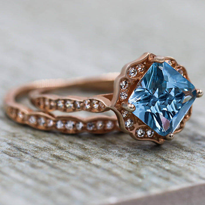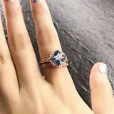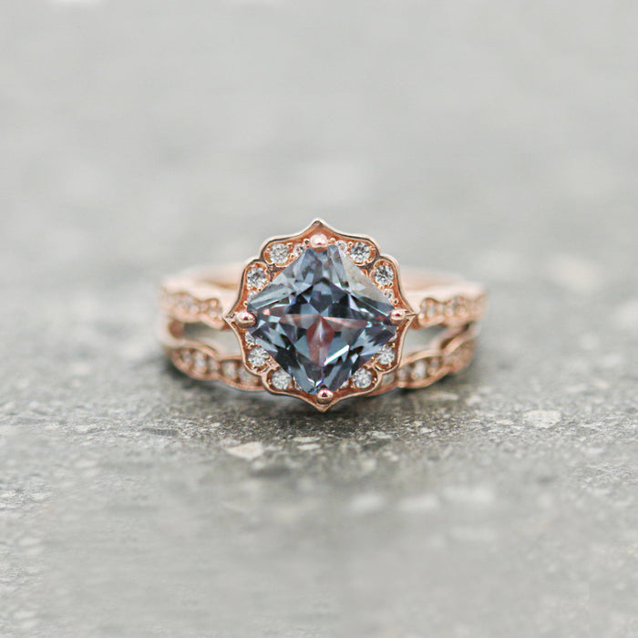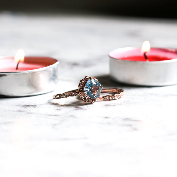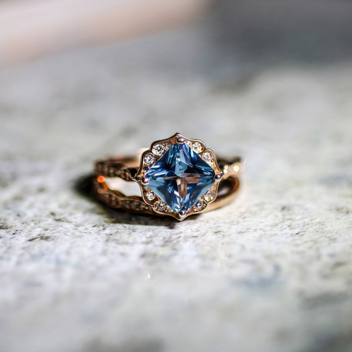 Named for the translucent shimmer of the haloed center stone, the accent stones within the river weave band complete the aesthetic.